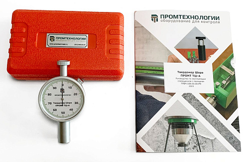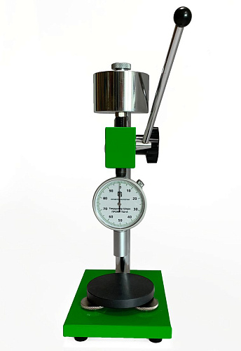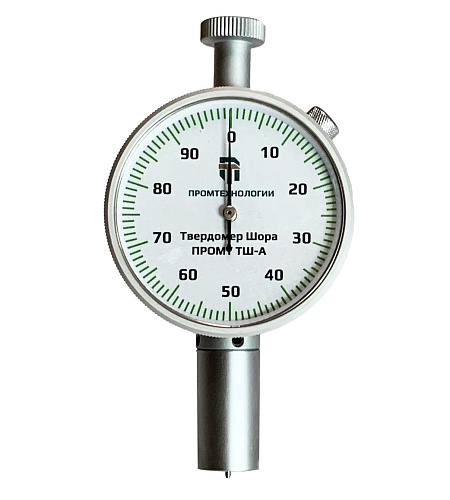 Это простой и надежный механический прибор с металлическим корпусом, индикатором часового типа, поворотным циферблатом для корректной установки нуля и удлиненной контактной площадкой облегчающей применение дюрометра. Внутри устройства установлена тарированная пружина обеспечивающая требуемое усилие на индентор специальной формы из закаленной стали и механизм фиксации его перемещения. Для проведения измерения в соответствии с ГОСТ также потребуется секундомер и термометр. Твердомер Шора ПРОМТ ТШ-А (тип А) не требует специальных навыков для работы с ним и позволяет оперативно контролировать твердость мягких резины и пластиков, силикона, винила и аналогичных материалов в лабораторных и цеховых условиях.